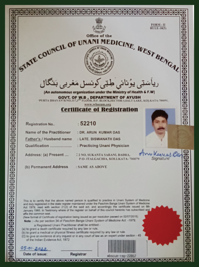 Dr. Arun Kumar Das is a highly respected Ayurvedic and Unani medicine practitioner with over two decades of experience in natural healing. As a Member of the State Council of Unani Medicine, Government of West Bengal, he has dedicated his career to providing holistic, personalized treatments that restore health and well-being.